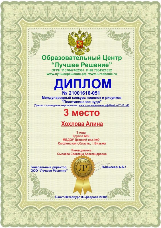 В феврале месяце Хохлова Алина воспитанница 2 младшей группы под руководством воспитателя Сысоевой Светланы Александровны участвовала в международном конкурсе поделок и рисунков «Пластилиновое чудо» и заняла призовое 3 место. Поздравляем!