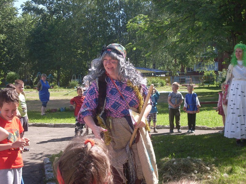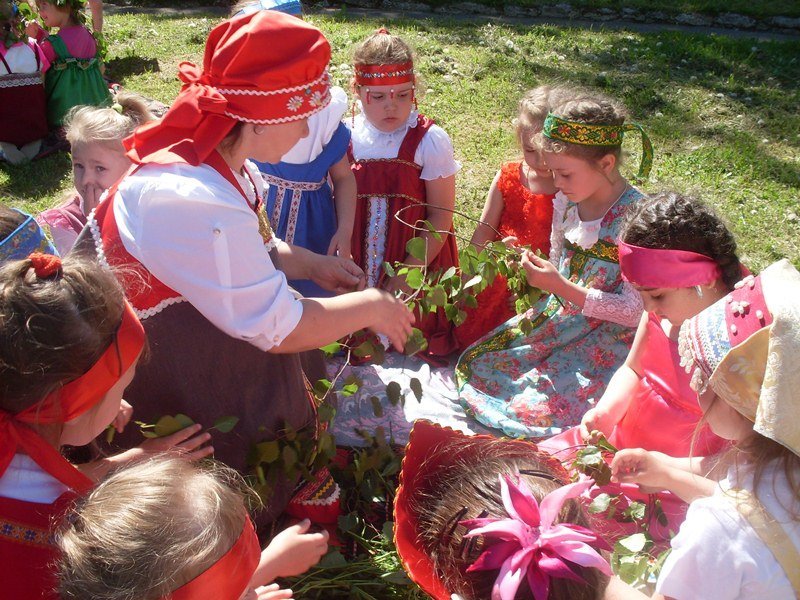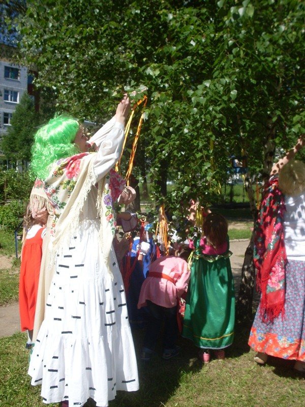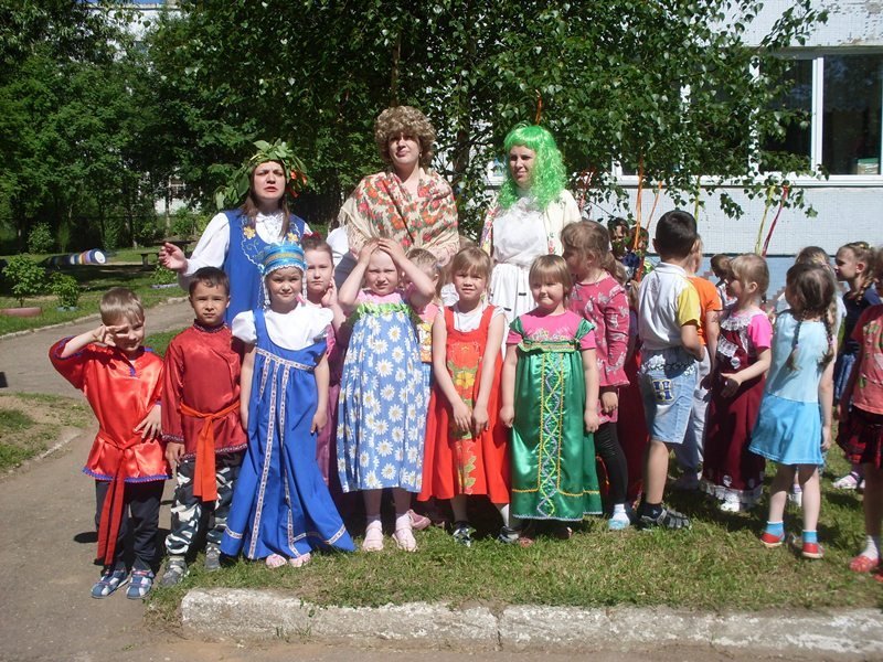 На празднике девочки были в красивых сарафанах, а мальчишки в ярких нарядных рубахах, все пели и плясали, водили хороводы, играли в русские народные игры, всем понравилась веселая игра "Карусель. В гости к детям приходили Кукушка, Черёмуха, Бабка-позыватка, Рябина, Баба Яга, но она была добрая, играла с детьми в игры, всех веселила. В заключение мероприятия, следуя народному обычаю, воспитатели вместе с детьми с удовольствием украсили березку лентами. Вот такой был у нас праздник!