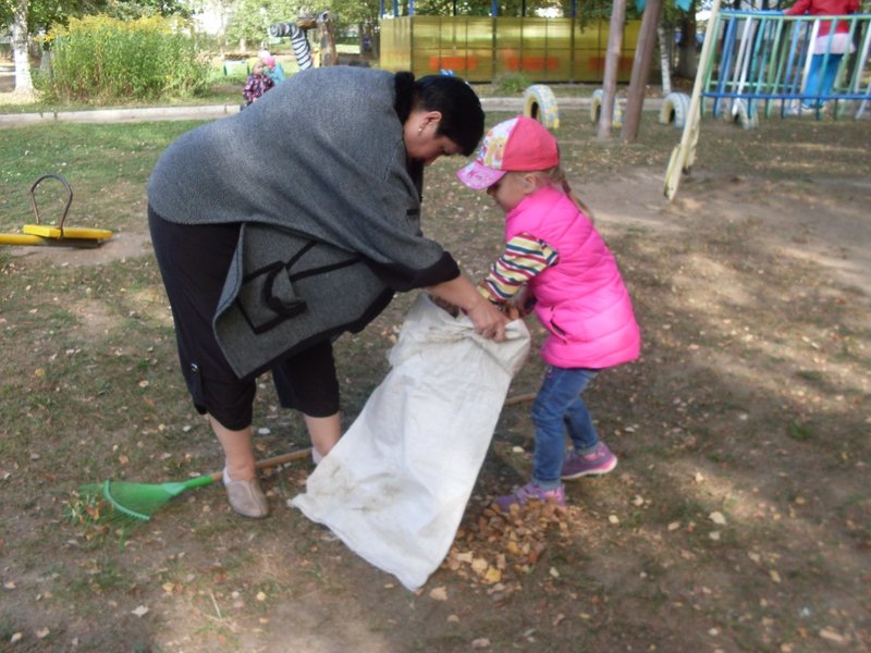 Ребята любят помогать воспитателям в уборке игрового участка. Вот и сегодня они вместе с воспитателями убирали опавшие листья. В работе старательно использовали имеющиеся трудовые навыки. В процессе таких трудовых поручений у детей формируется интерес к труду в природе, экологическое сознание. В работе воспитывается ответственность за порученное дело, трудолюбие.