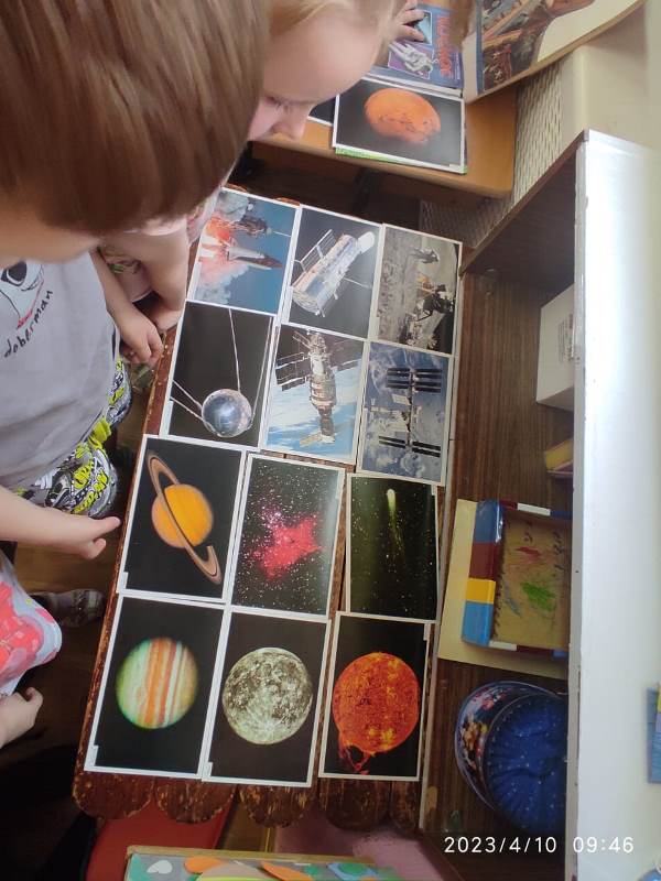 Ребятишек увлекли беседы на темы: "Космос - это интересно", "Планеты солнечной системы", "Земля — голубая жемчужина Вселенной", "Что такое невесомость?". Ребята рассмотрели на слайдах воздушные шары, дирижабли, аэропланы, самолёты, вертолёты. Дети задавали вопросы, рассуждали, делали выводы. С большим интересом они познакомились с Солнечной системой, в которой находится наша планета Земля, узнали о Луне, спутнике Земли.