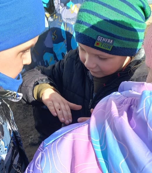 Во время прогулки ребята подготовительной группы №10 заметили и с интересом наблюдали за божьей коровкой