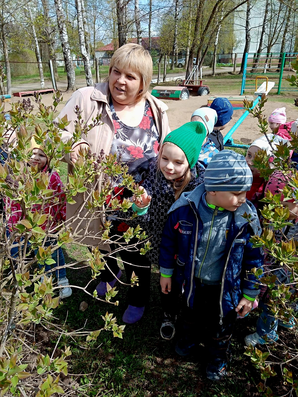 На прогулке ребята группы № 9 рассмотрели, как начинают распускаться листья сирени. Вместе с воспитателем Анастасией Евгеньевной Прашмут дети вспомнили части растений, что необходимо деревьям и кустарникам для жизни и развития, послушали «о чем шумят листочки», а также поговорили о том, почему нужно беречь природу.