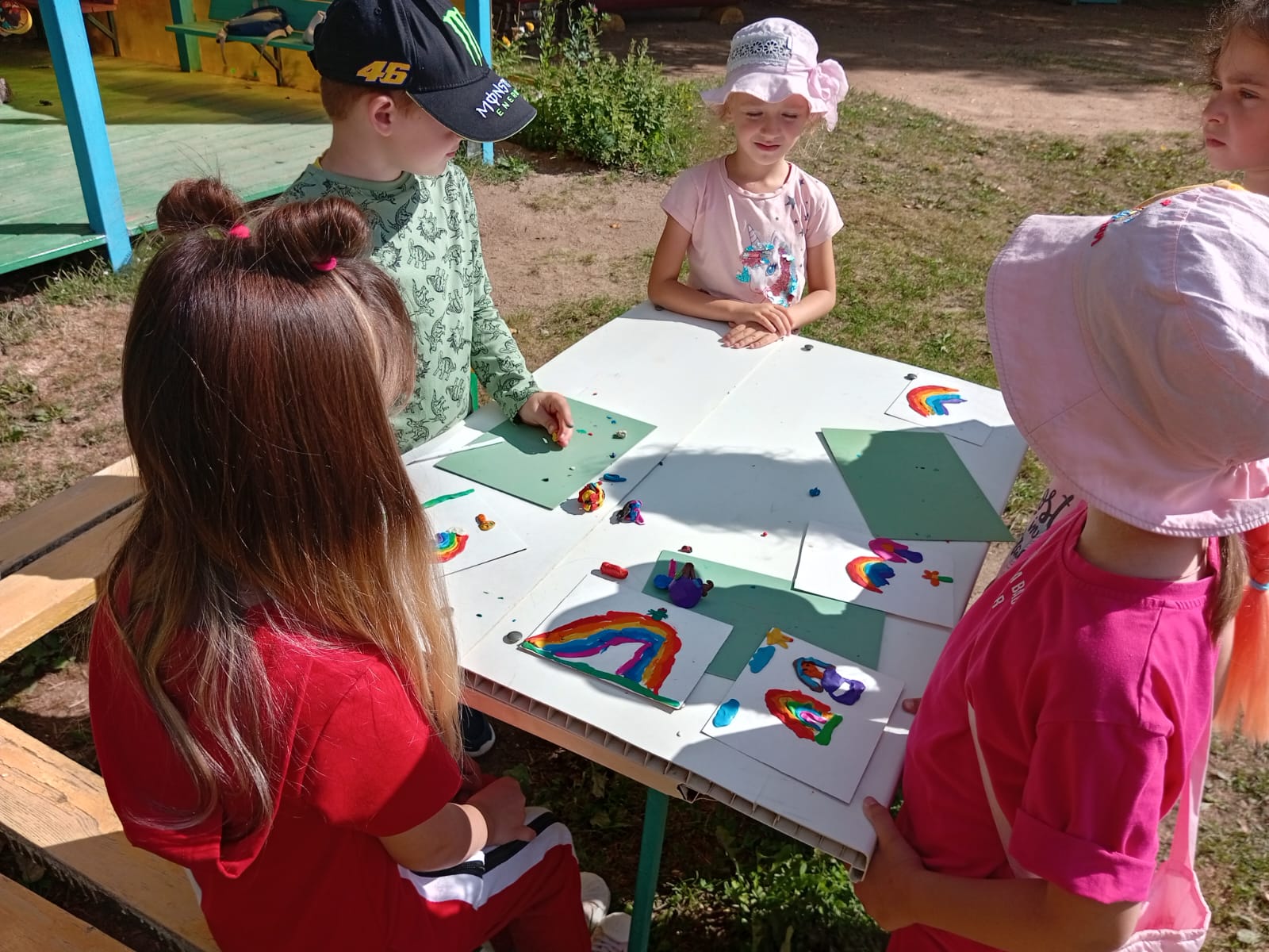 Дети познакомились с этим природным явлением, узнали историю появления радуги на небе, узнали, что радуга состоит из солнечного света, который проходит сквозь мельчайшие капельки воды и окрашивает их в разные цвета. Так же ребята отгадывали загадки, играли в игры, рисовали радугу, лепили её из пластилина.